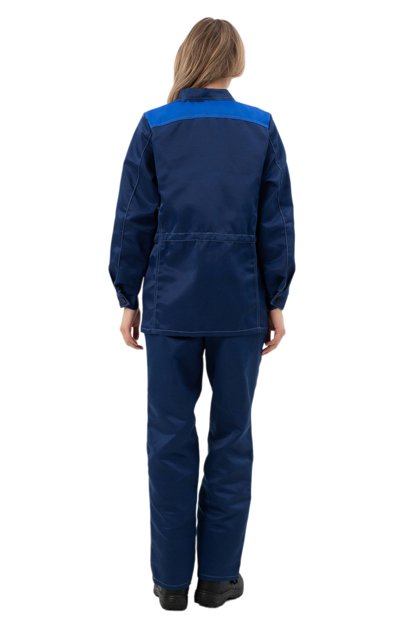 ➠ Куртка прямая, с центральной бортовой супатной застежкой на петли и пуговицы. Воротник отложной. Полочки с рельефами. Два нижних накладных кармана с фигурными клапанами. Левый нагрудный карман с отделением для ручки. Рукава с манжетами, застегивающимися на пуговицу. В области талии кулиса со шнуром и фиксатором.